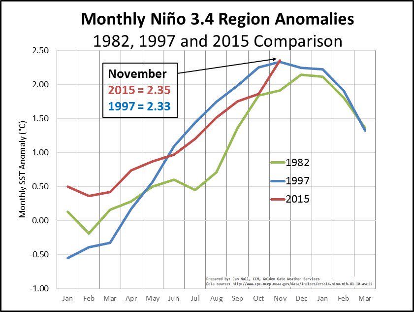 Specifically, the water temperature in this region was about 2.35 degrees Celsius above average in November 2015, topping the previous record monthly anomaly from November 1997 by 0.02 degrees Celsius, in reliable records dating to 1950